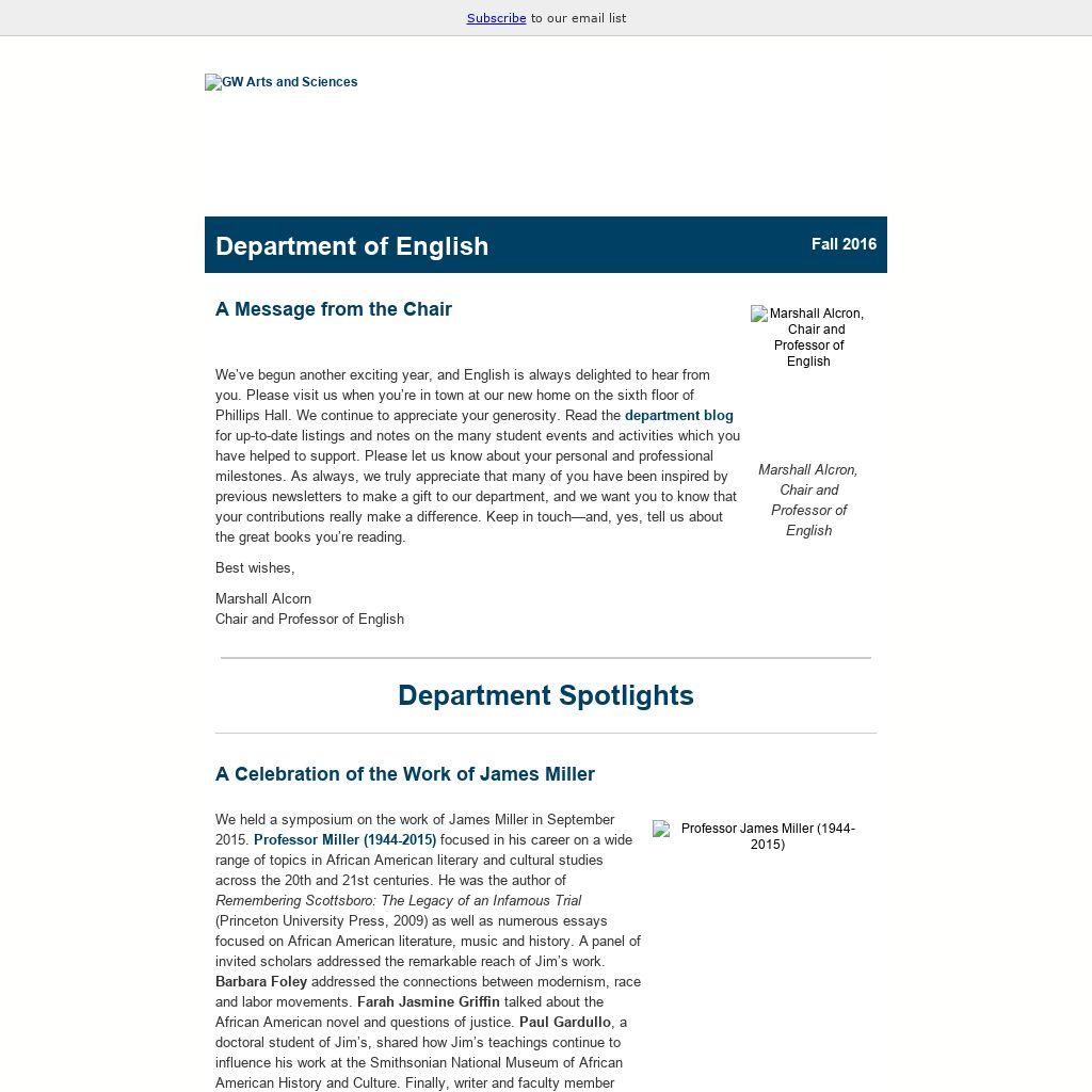 The Department of English would like to gratefully acknowledge the following generous donors who made a gift to the department from July 1, 2015 – June 30, 2016.