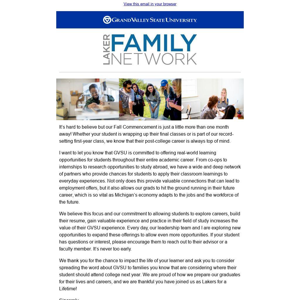 We thank you for the chance to impact the life of your learner and ask you to consider spreading the word about GVSU to families you know that are considering where their student should attend college next year. We are proud of how we prepare our graduates for their lives and careers, and we are thankful you have joined us as Lakers for a Lifetime!