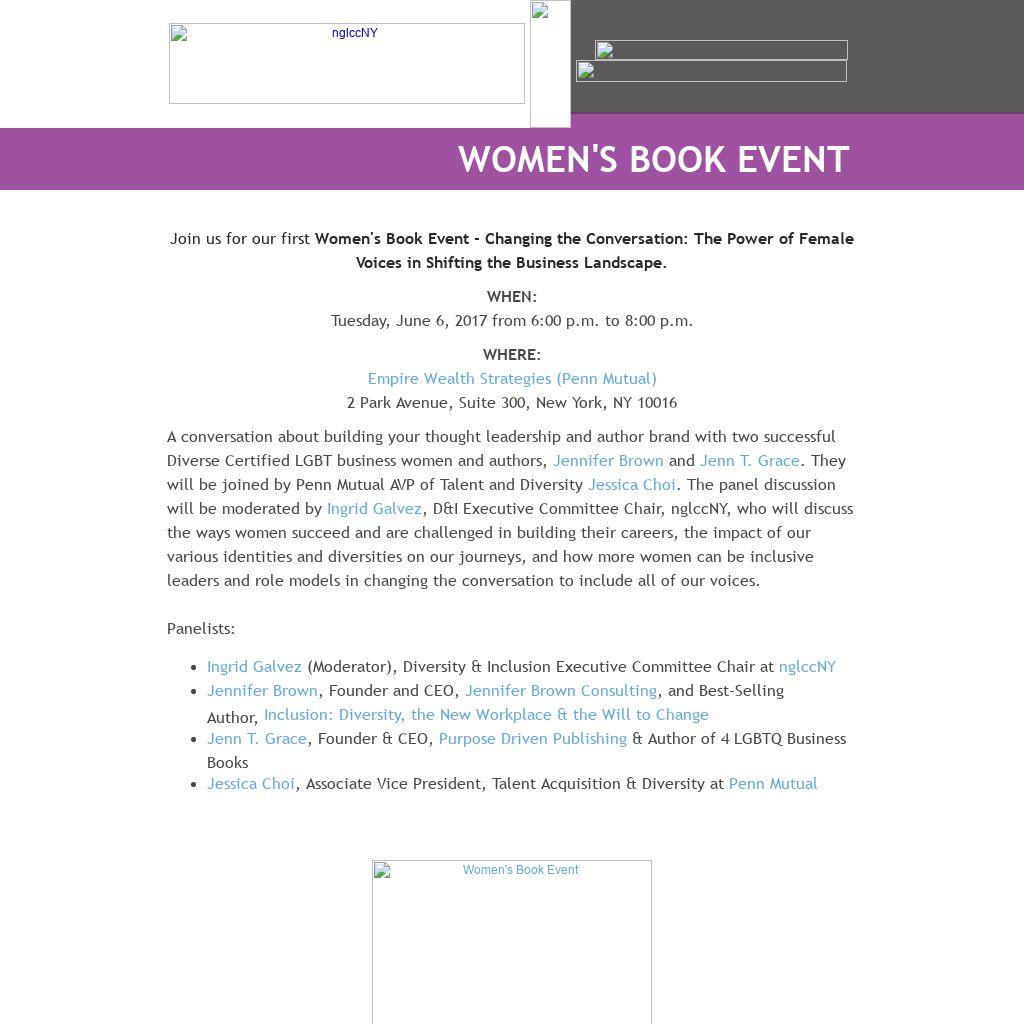 A conversation about building your thought leadership and author brand with two successful Diverse Certified LGBT business women and authors, Jennifer Brown and Jenn T. Grace. They will be joined by Penn Mutual AVP of Talent and Diversity Jessica Choi. The panel discussion will be moderated by Ingrid Galvez, D&I Executive Committee Chair, nglccNY, who will discuss the ways women succeed and are challenged in building their careers, the impact of our various identities and diversities on our journeys, and how more women can be inclusive leaders and role models in changing the conversation to include all of our voices.