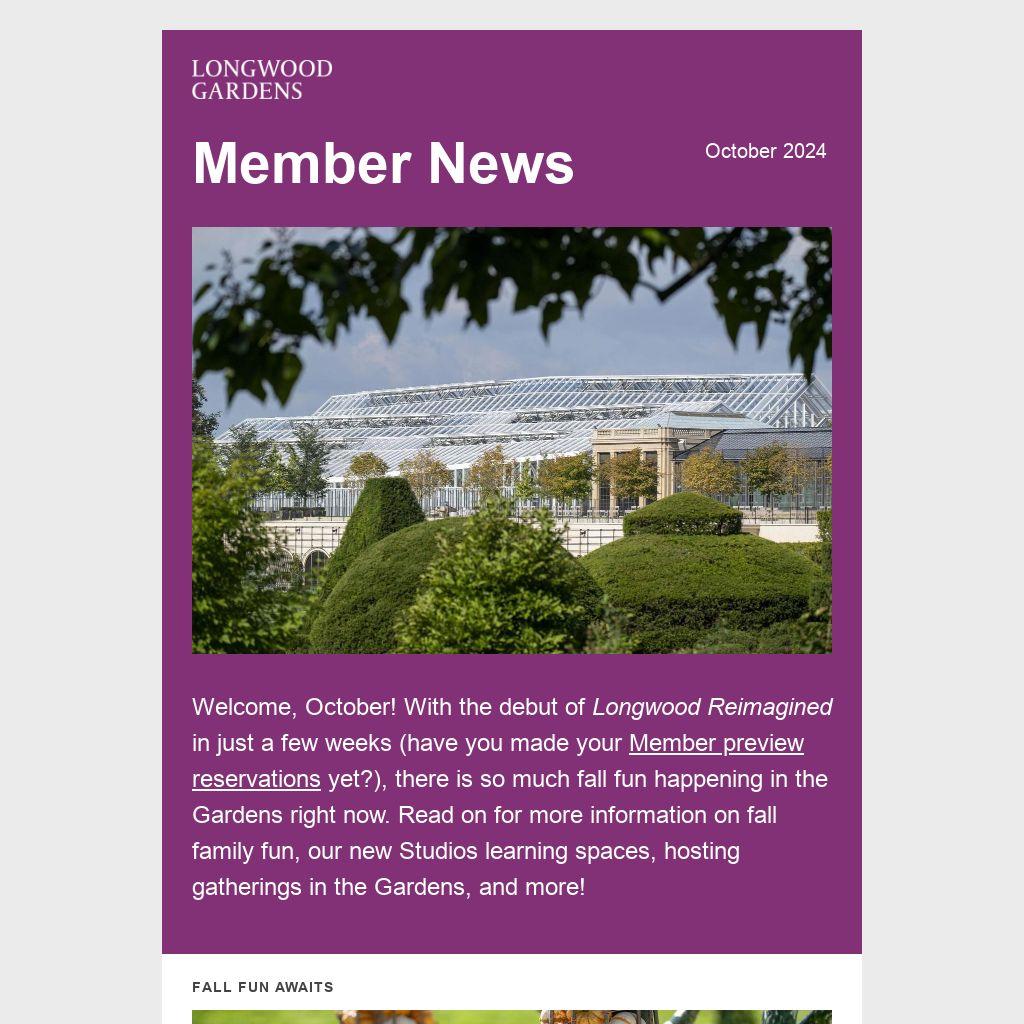 Welcome, October! With the debut of Longwood Reimagined in just a few weeks (have you made your Member preview reservations yet?), there is so much fall fun happening in the Gardens right now. Read on for more information on fall family fun, our new Studios learning spaces, hosting gatherings in the Gardens, and more!