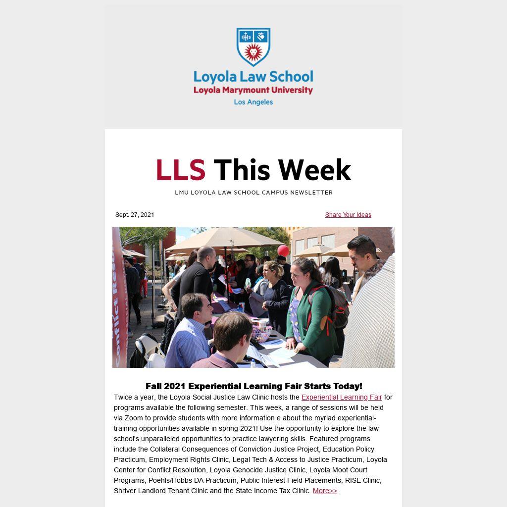 Twice a year, the Loyola Social Justice Law Clinic hosts the Experiential Learning Fair for programs available the following semester. This week, a range of sessions will be held via Zoom to provide students with more information e about the myriad experiential-training opportunities available in spring 2021! Use the opportunity to explore the law school's unparalleled opportunities to practice lawyering skills. Featured programs include the Collateral Consequences of Conviction Justice Project, Education Policy Practicum, Employment Rights Clinic, Legal Tech & Access to Justice Practicum, Loyola Center for Conflict Resolution, Loyola Genocide Justice Clinic, Loyola Moot Court Programs, Poehls/Hobbs DA Practicum, Public Interest Field Placements, RISE Clinic, Shriver Landlord Tenant Clinic and the State Income Tax Clinic. More>>