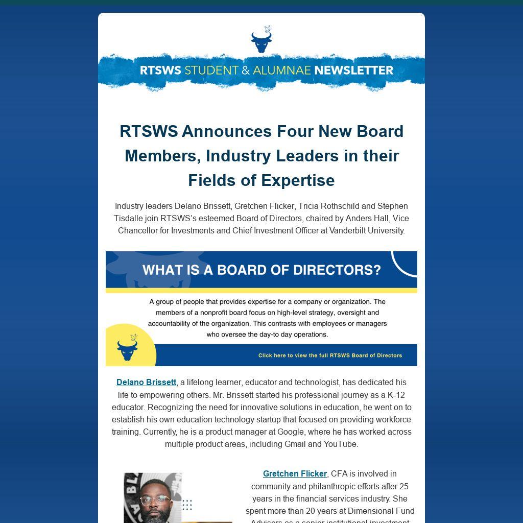 Industry leaders Delano Brissett, Gretchen Flicker, Tricia Rothschild and Stephen Tisdalle join RTSWS’s esteemed Board of Directors, chaired by Anders Hall, Vice Chancellor for Investments and Chief Investment Officer at Vanderbilt University.
