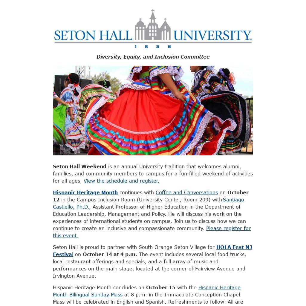 October is Global Diversity Awareness Month which pays tribute to the diverse minds and beliefs held by all cultures around the world. Goal 4 of Seton Hall’s Strategic Plan focuses on further cultivating and nurturing a trusting and collaborative Seton Hall community that educates and empowers all its members to advance equity, inclusion and social justice on campus and in the wider world.