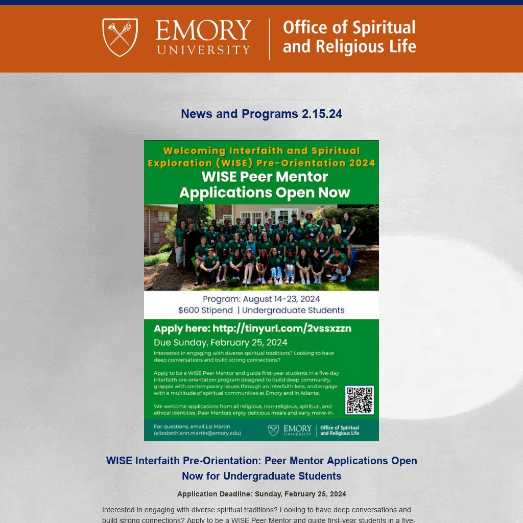 Emory OSRL ENews is published weekly during term by the Emory University Office of Spiritual and Religious Life publicizing Atlanta-campus spiritual life programs. It is not a comprehensive listing. For Oxford College spiritual life, please click here. To submit information or to update your preferences, please contact religiouslife@emory.edu.