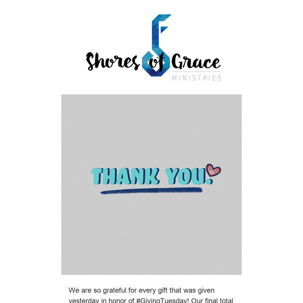 Still want to give towards our Giving Tuesday campaign, but afraid you missed out? Well, it is never too late to give! Shores of Grace Ministry is always accepting gifts and donations through our site, www.shoresofgrace.com, and we will continue striving for our $40,000 goal by the end of the year. Thank you, again, for choosing to sow into what God is doing through Shores around the world. We couldn't do it without you!