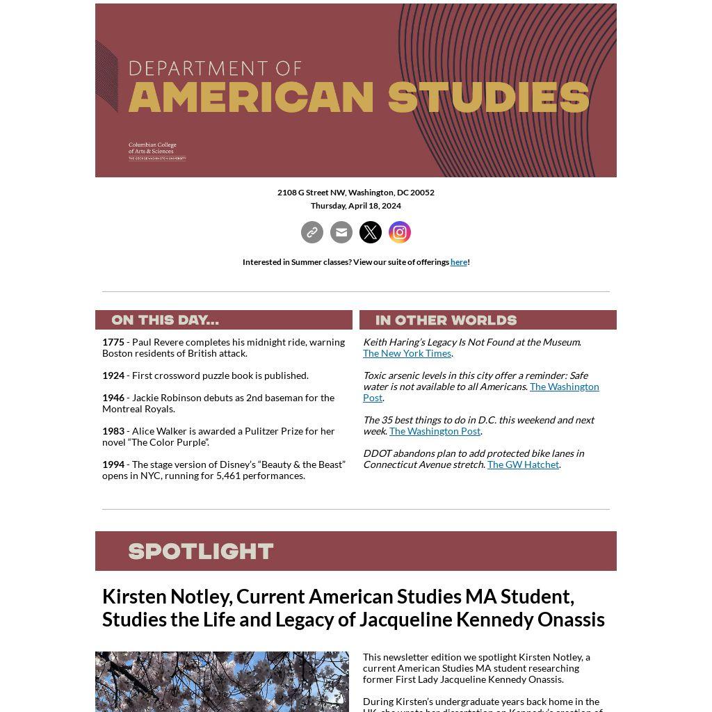 | This newsletter edition we spotlight Kirsten Notley, a current American Studies MA student researching former First Lady Jacqueline Kennedy Onassis.