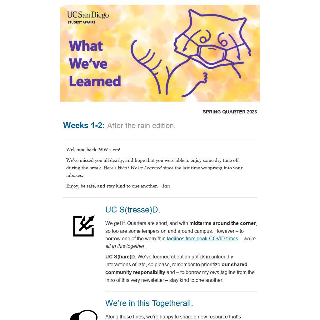 UC S(hare)D. We’ve learned about an uptick in unfriendly interactions of late, so please, remember to prioritize our shared community responsibility and – to borrow my own tagline from the intro of this very newsletter – stay kind to one another.