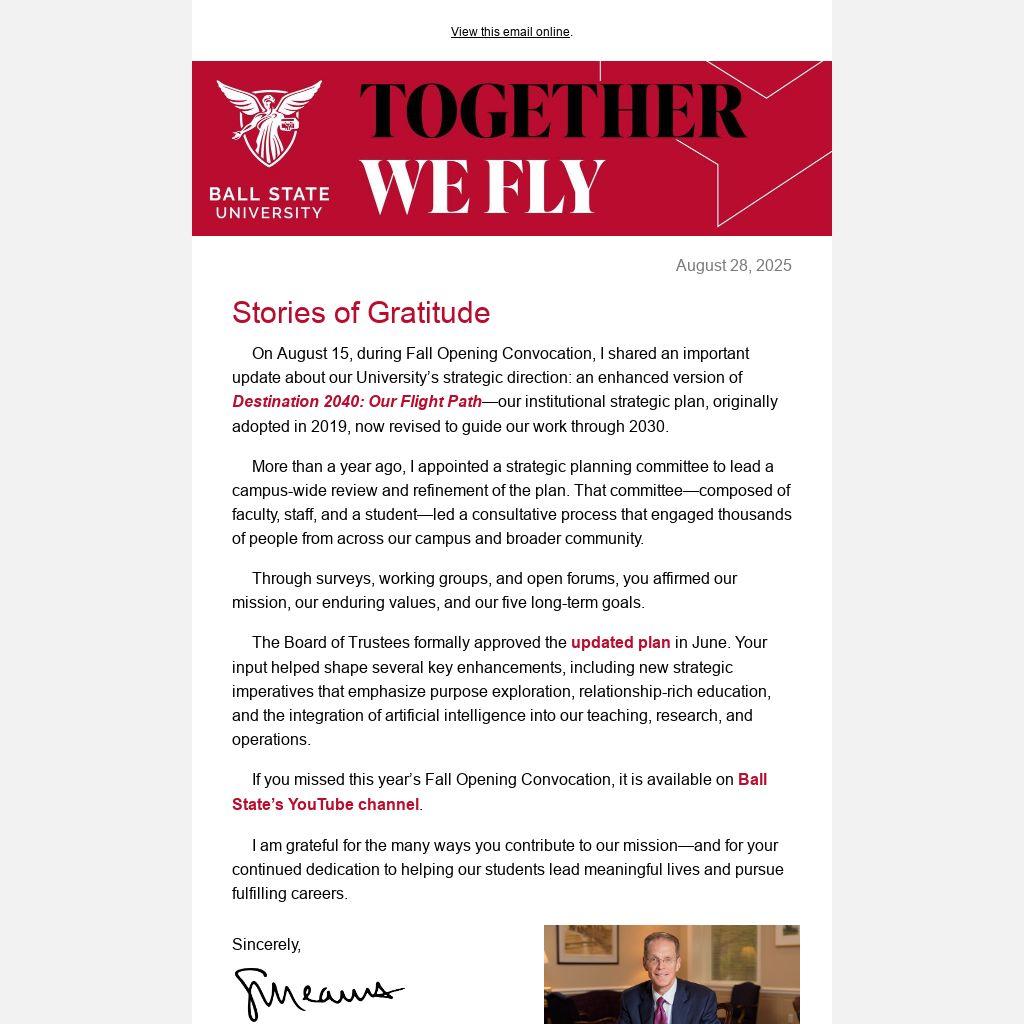On August 15, during Fall Opening Convocation, I shared an important update about our University’s strategic direction: an enhanced version of Destination 2040: Our Flight Path—our institutional strategic plan, originally adopted in 2019, now revised to guide our work through 2030.