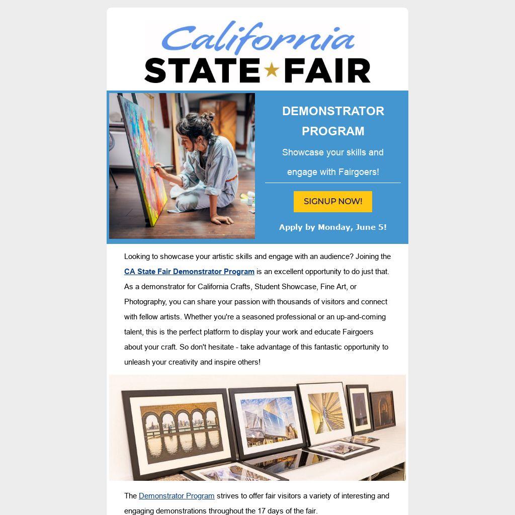 Looking to showcase your artistic skills and engage with an audience? Joining the CA State Fair Demonstrator Program is an excellent opportunity to do just that. As a demonstrator for California Crafts, Student Showcase, Fine Art, or Photography, you can share your passion with thousands of visitors and connect with fellow artists. Whether you're a seasoned professional or an up-and-coming talent, this is the perfect platform to display your work and educate Fairgoers about your craft. So don't hesitate - take advantage of this fantastic opportunity to unleash your creativity and inspire others!