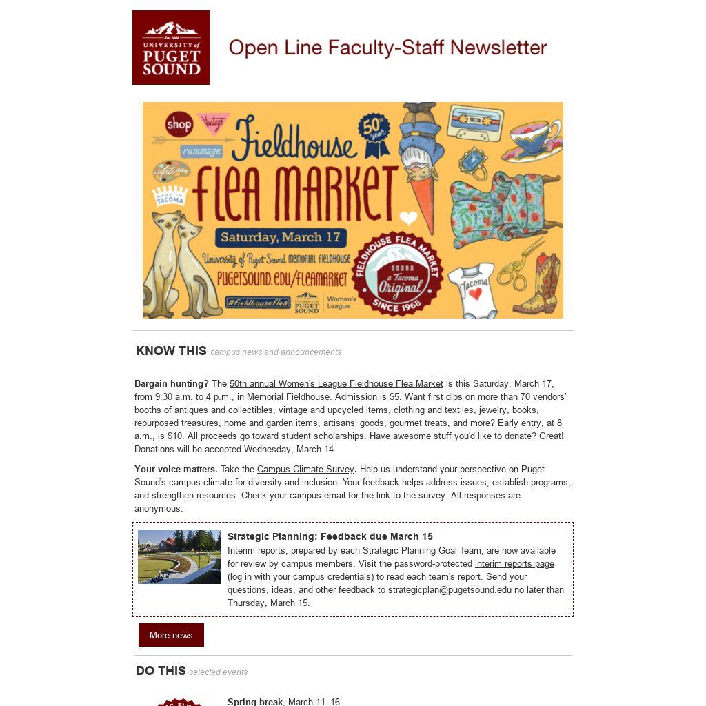 Bargain hunting? The 50th annual Women's League Fieldhouse Flea Market is this Saturday, March 17, from 9:30 a.m. to 4 p.m., in Memorial Fieldhouse. Admission is $5. Want first dibs on more than 70 vendors’ booths of antiques and collectibles, vintage and upcycled items, clothing and textiles, jewelry, books, repurposed treasures, home and garden items, artisans’ goods, gourmet treats, and more? Early entry, at 8 a.m., is $10. All proceeds go toward student scholarships. Have awesome stuff you'd like to donate? Great! Donations will be accepted Wednesday, March 14. Your voice matters. Take the Campus Climate Survey. Help us understand your perspective on Puget Sound's campus climate for diversity and inclusion. Your feedback helps address issues, establish programs, and strengthen resources. Check your campus email for the link to the survey. All responses are anonymous.