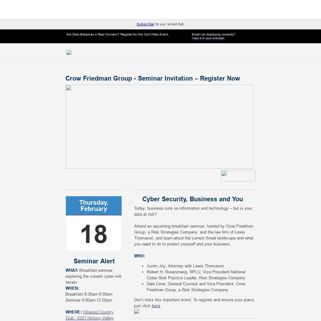 Attend an upcoming breakfast seminar, hosted by Crow Friedman Group, a Risk Strategies Company, and the law firm of Lewis Thomason, and learn about the current threat landscape and what you need to do to protect yourself and your business.