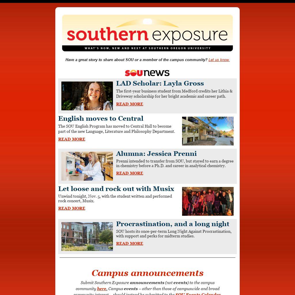 Submit Southern Exposure announcements (not events) to the campus community here. Campus events – other than those of campuswide and broad community interest – should instead be submitted to the SOU Events Calendar.