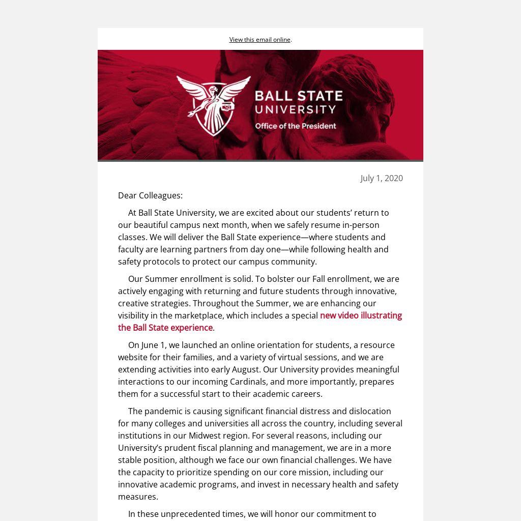 At Ball State University, we are excited about our students’ return to our beautiful campus next month, when we safely resume in-person classes. We will deliver the Ball State experience—where students and faculty are learning partners from day one—while following health and safety protocols to protect our campus community.