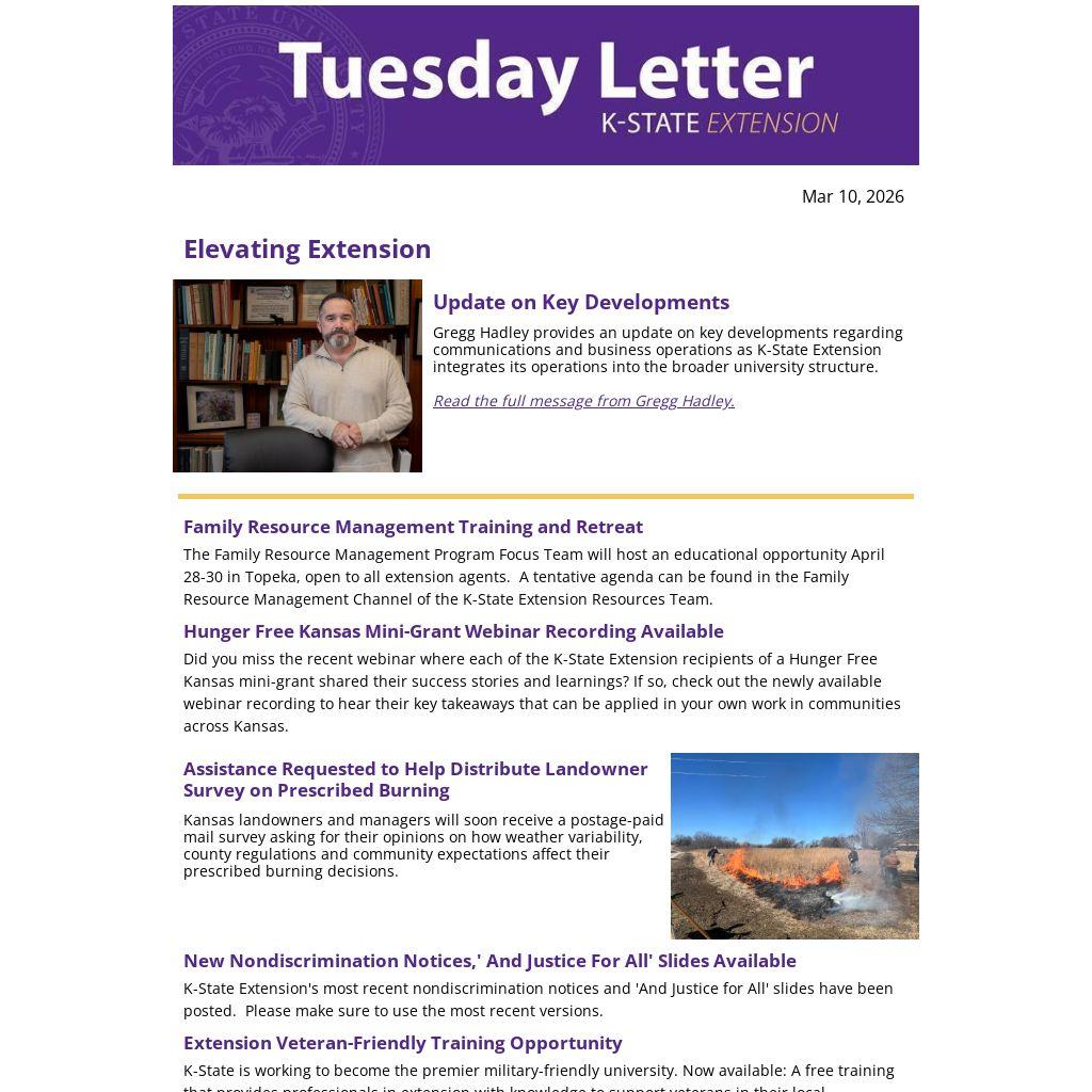 | Gregg Hadley provides an update on key developments regarding communications and business operations as K-State Extension integrates its operations into the broader university structure.