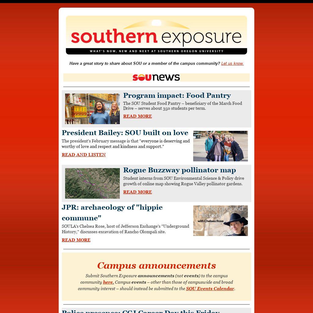 Submit Southern Exposure announcements (not events) to the campus community here. Campus events – other than those of campuswide and broad community interest – should instead be submitted to the SOU Events Calendar.