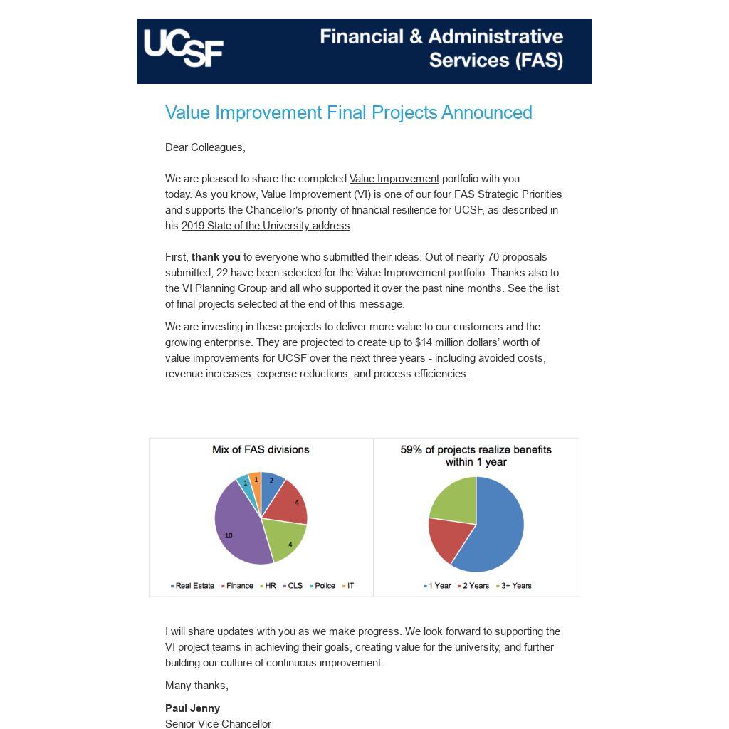 I will share updates with you as we make progress. We look forward to supporting the VI project teams in achieving their goals, creating value for the university, and further building our culture of continuous improvement.