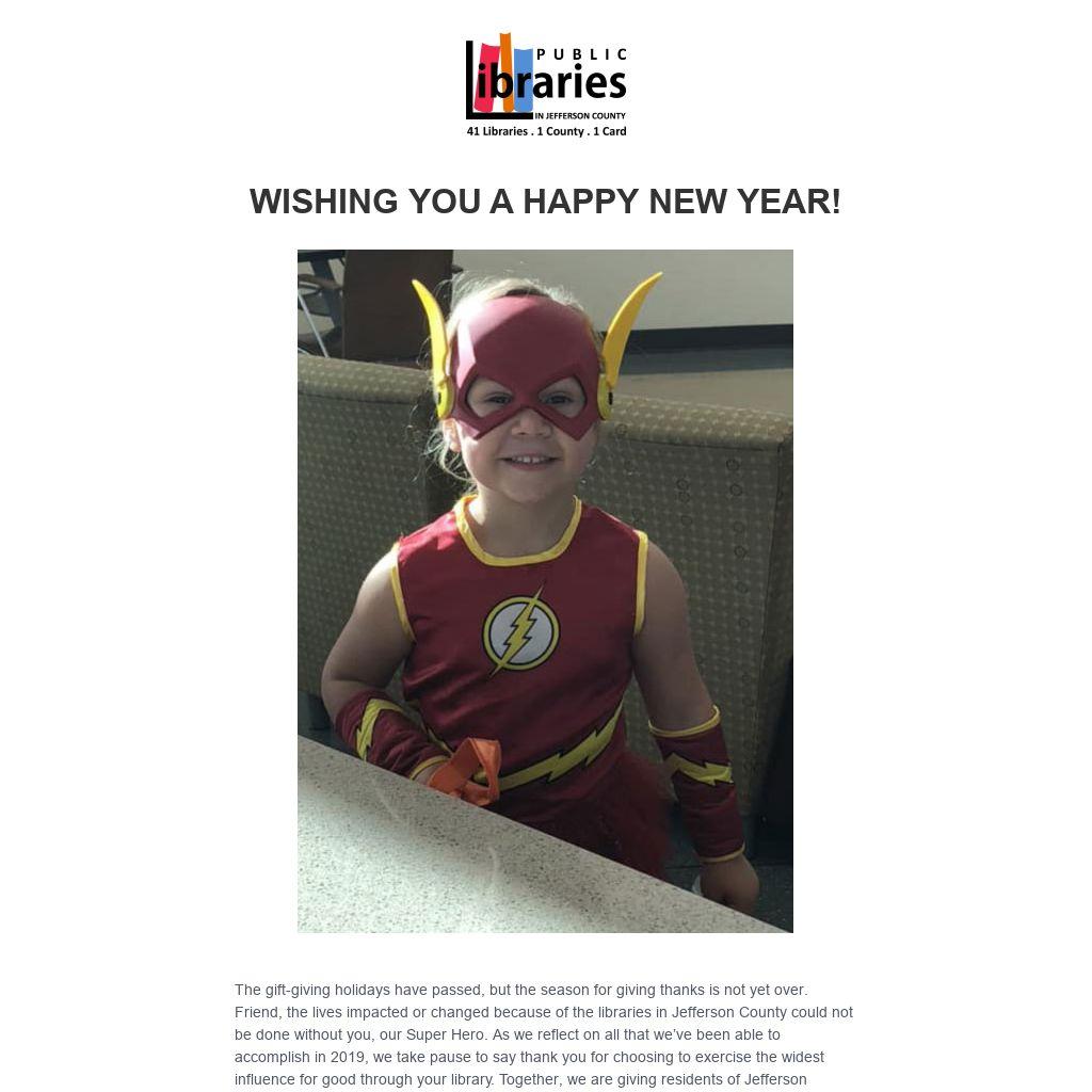 The gift-giving holidays have passed, but the season for giving thanks is not yet over. Friend, the lives impacted or changed because of the libraries in Jefferson County could not be done without you, our Super Hero. As we reflect on all that we’ve been able to accomplish in 2019, we take pause to say thank you for choosing to exercise the widest influence for good through your library. Together, we are giving residents of Jefferson County the opportunity to reach their fullest potential and to make a difference in the world—not just now, but for years to come. On this final day of a wonderfully successful year for our libraries, we want you to know how grateful we are for you and your continued support. Warmest wishes to you, and cheers to a happy New Year!
