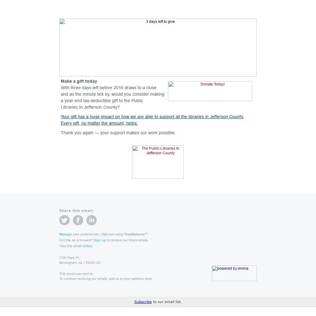With three days left before 2016 draws to a close and as the minute tick by, would you consider making a year-end tax-deductible gift to the Public Libraries In Jefferson County?
