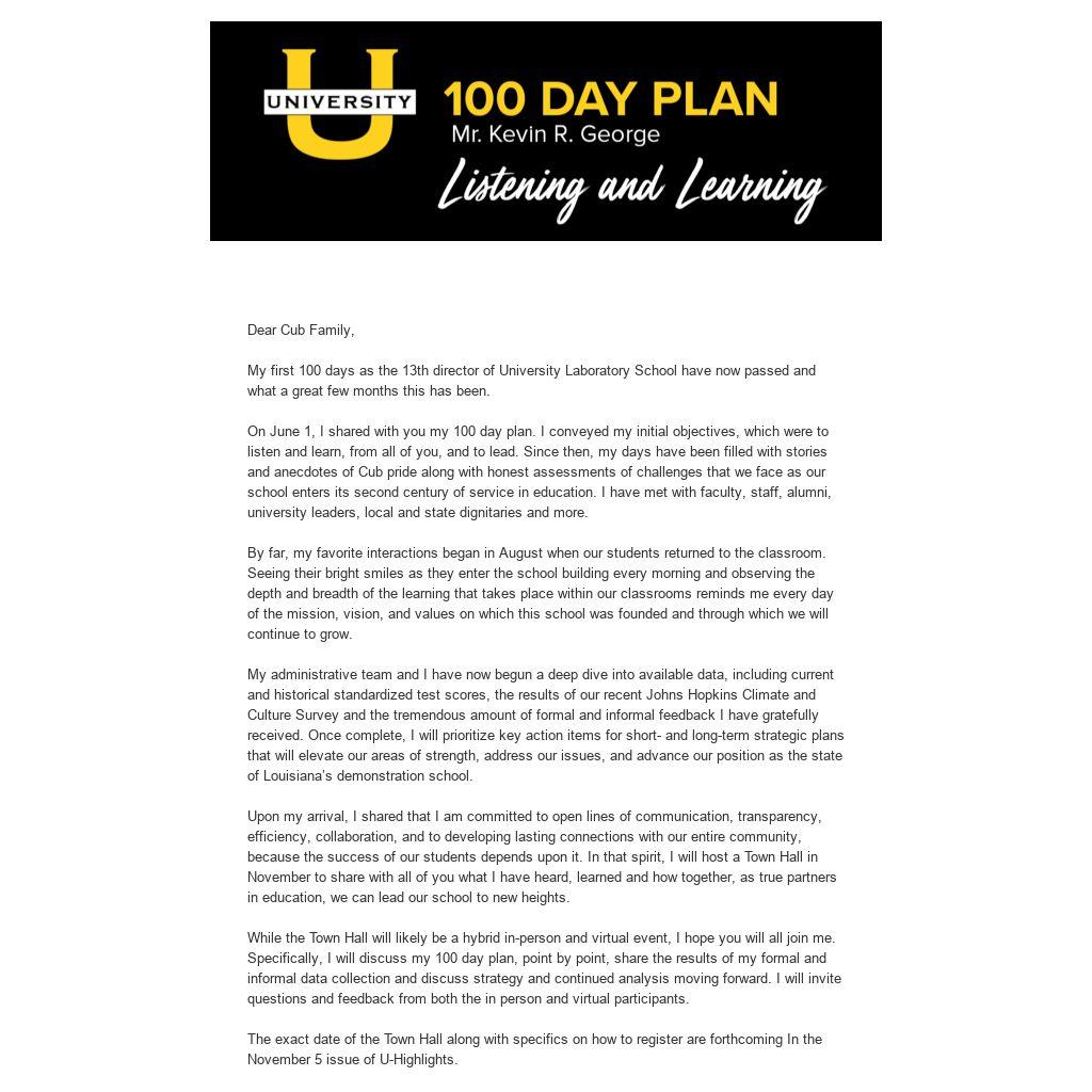 On June 1, I shared with you my 100 day plan. I conveyed my initial objectives, which were to listen and learn, from all of you, and to lead. Since then, my days have been filled with stories and anecdotes of Cub pride along with honest assessments of challenges that we face as our school enters its second century of service in education. I have met with faculty, staff, alumni, university leaders, local and state dignitaries and more.