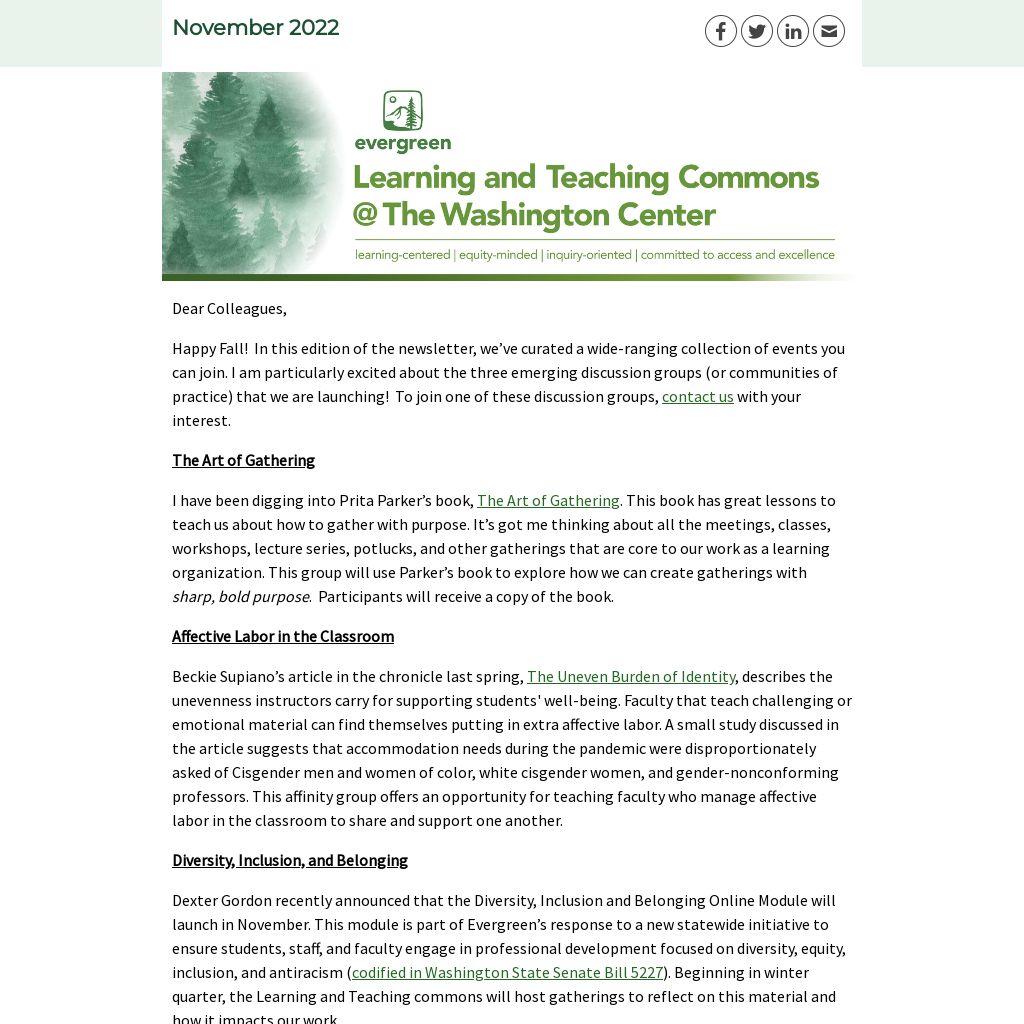 Dexter Gordon recently announced that the Diversity, Inclusion and Belonging Online Module will launch in November. This module is part of Evergreen’s response to a new statewide initiative to ensure students, staff, and faculty engage in professional development focused on diversity, equity, inclusion, and antiracism (codified in Washington State Senate Bill 5227). Beginning in winter quarter, the Learning and Teaching commons will host gatherings to reflect on this material and how it impacts our work.