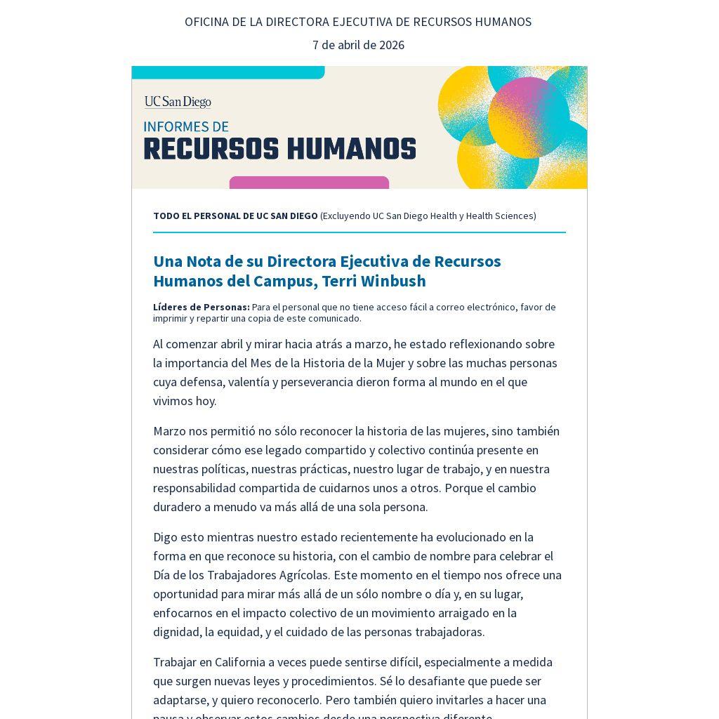 Aparten la fecha para el martes 12 de mayo, de 1:30 a 3 p.m., para para nuestro próximo informe directivo, que se centrará en la evaluación del desempeño del personal, así como en temas críticos y relevantes que más importan al personal de UC San Diego. ¿No pueden asistir el día del evento? Una grabación estará disponible en Blink unos días después de la reunión. Regístrense con anticipación y envíen sus preguntas a través de Zoom.