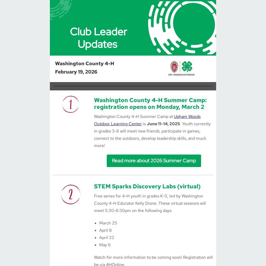 Please submit your information for the March 2026 Cloverline by Friday, February 20. The March Cloverline is scheduled to be published on Monday, February 23 (fourth Monday of the month). Send your information by email to karen.girard@wisc.edu or submit here: https://forms.gle/yV71MuX8RREWqysGA
