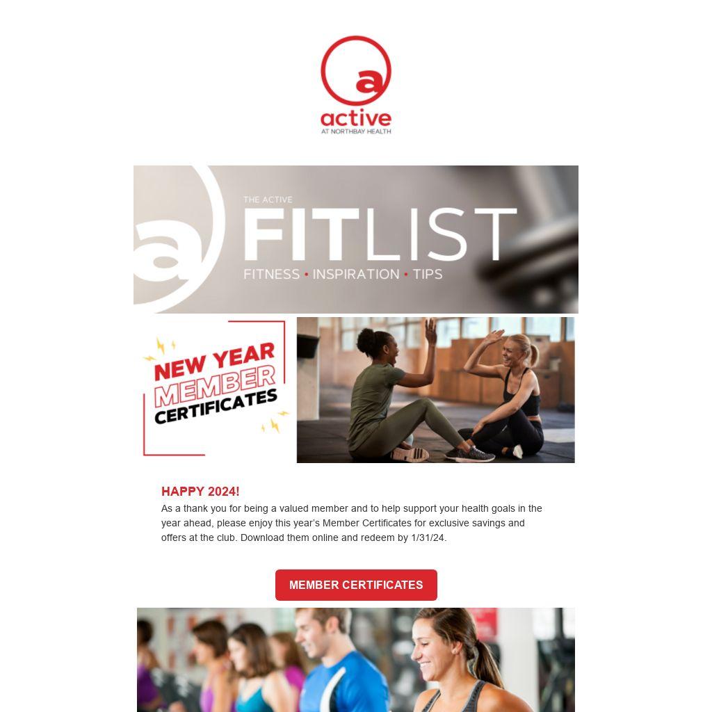 HAPPY 2024!As a thank you for being a valued member and to help support your health goals in the year ahead, please enjoy this year’s Member Certificates for exclusive savings and offers at the club. Download them online and redeem by 1/31/24.