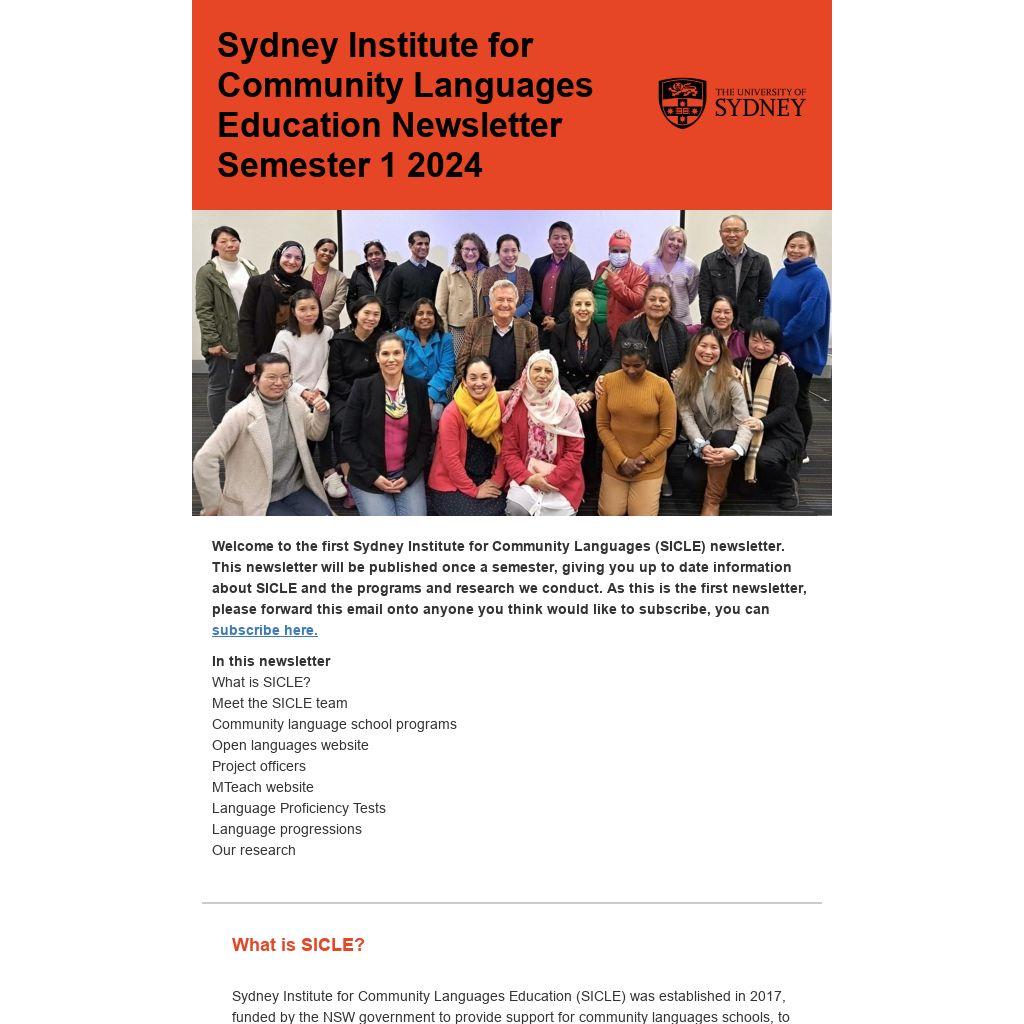 Welcome to the first Sydney Institute for Community Languages (SICLE) newsletter. This newsletter will be published once a semester, giving you up to date information about SICLE and the programs and research we conduct. As this is the first newsletter, please forward this email onto anyone you think would like to subscribe, you can subscribe here.
