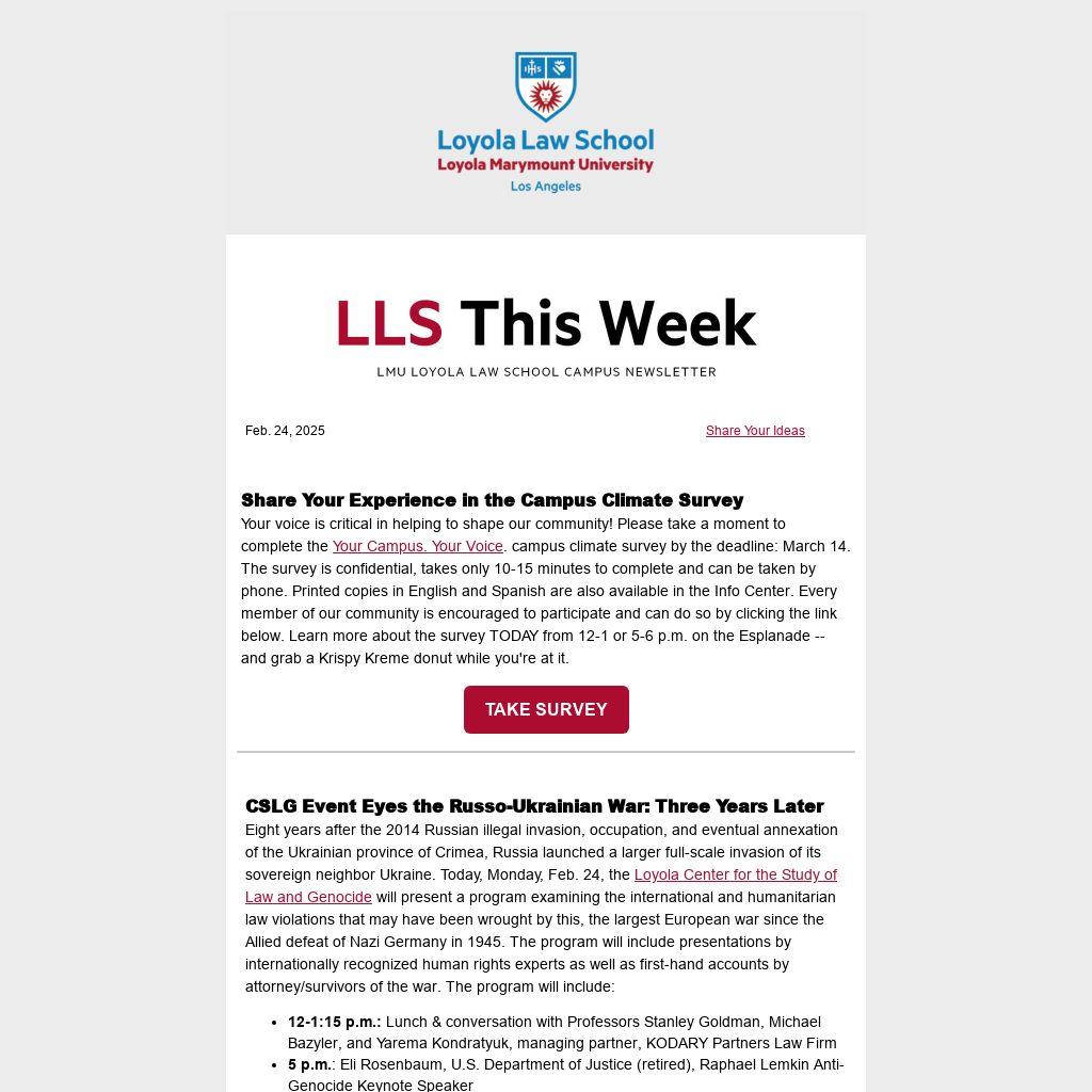 Official law school events are noted above or summarized in the space below. Event coordinators are encouraged to use the LLS Events Calendar for events they want promoted broadly. Members of the LLS community should select "LOG IN WITH SCHOOL ID," which will prompt the system to use your single sign-on credentials to allow you to create posts. Note: You must select "Loyola Law School" in the department field in order for the event to display in the LLS roundup. Questions? Email us!