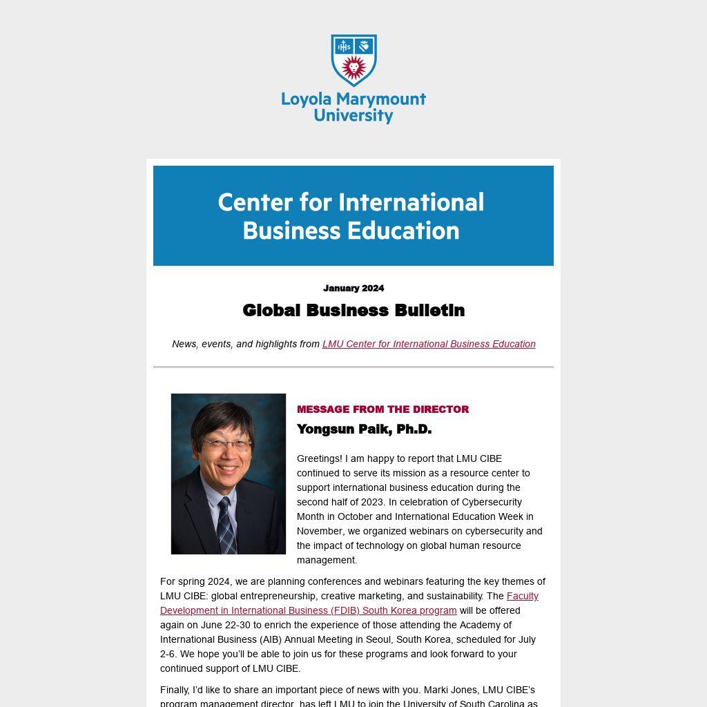 Greetings! I am happy to report that LMU CIBE continued to serve its mission as a resource center to support international business education during the second half of 2023. In celebration of Cybersecurity Month in October and International Education Week in November, we organized webinars on cybersecurity and the impact of technology on global human resource management.