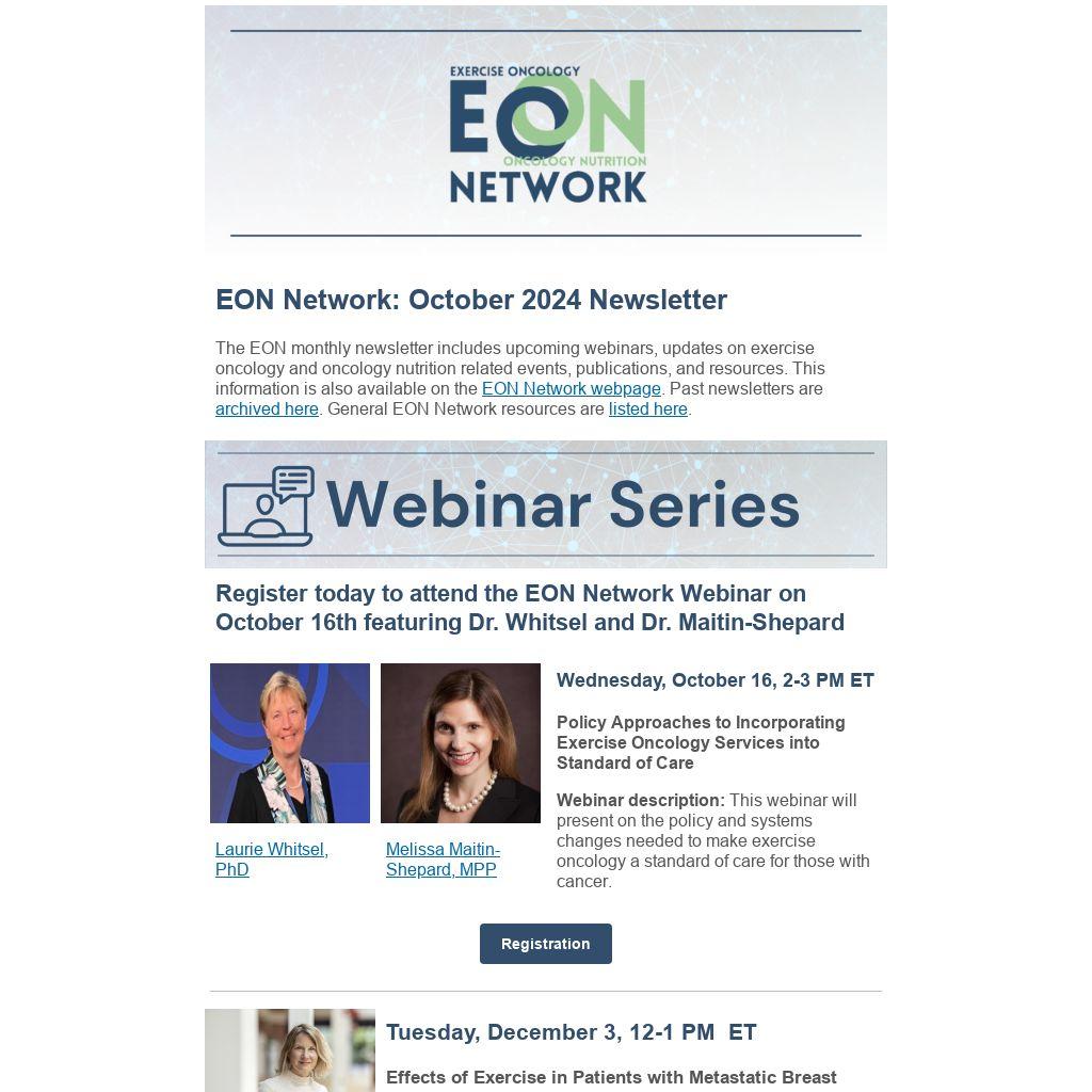 The EON monthly newsletter includes upcoming webinars, updates on exercise oncology and oncology nutrition related events, publications, and resources. This information is also available on the EON Network webpage. Past newsletters are archived here. General EON Network resources are listed here.