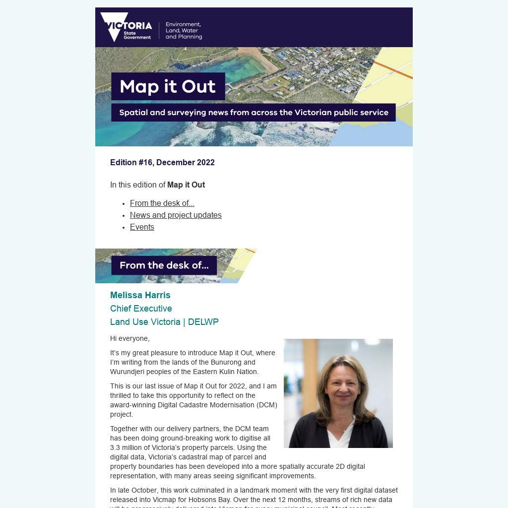 Thank you also to all the stakeholders and customers who are on this journey with us, and we’re looking forward to further engagement in 2023. Please visit our Land.Vic website or email the DCM and Vicmap teams for further information.