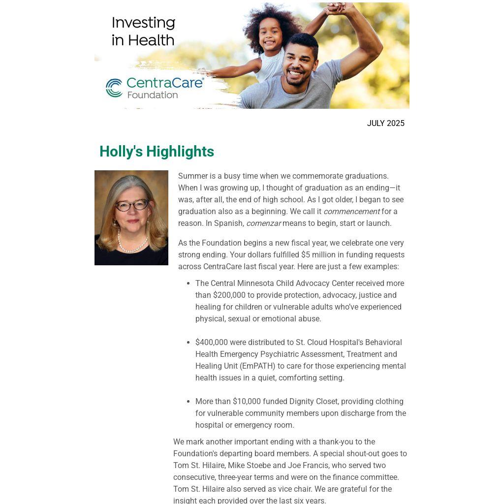 We mark another important ending with a thank-you to the Foundation's departing board members. A special shout-out goes to Tom St. Hilaire, Mike Stoebe and Joe Francis, who served two consecutive, three-year terms and were on the finance committee. Tom St. Hilaire also served as vice chair. We are grateful for the insight each provided over the last six years.