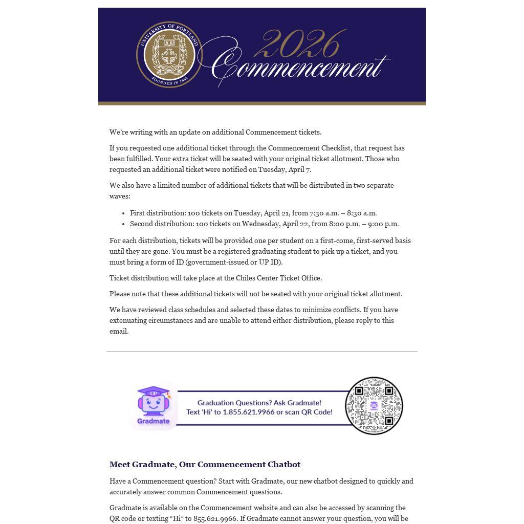 We’re writing with an update on additional Commencement tickets.