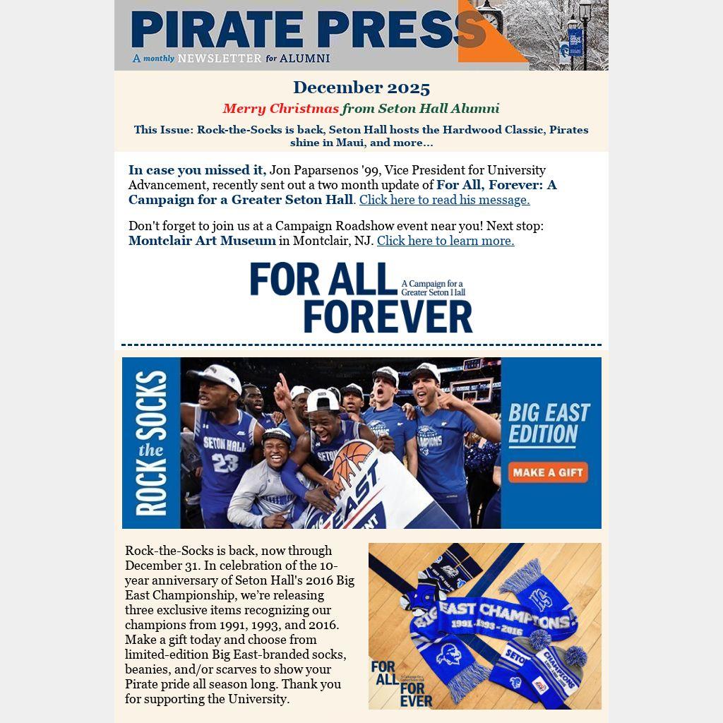In case you missed it, Jon Paparsenos '99, Vice President for University Advancement, recently sent out a two month update of For All, Forever: A Campaign for a Greater Seton Hall. Click here to read his message.
