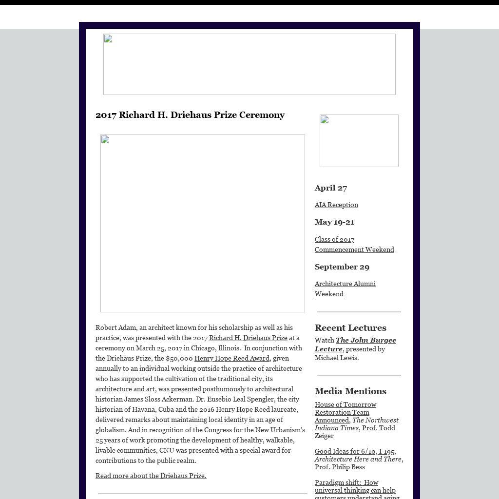 Robert Adam, an architect known for his scholarship as well as his practice, was presented with the 2017 Richard H. Driehaus Prize at a ceremony on March 25, 2017 in Chicago, Illinois. In conjunction with the Driehaus Prize, the $50,000 Henry Hope Reed Award, given annually to an individual working outside the practice of architecture who has supported the cultivation of the traditional city, its architecture and art, was presented posthumously to architectural historian James Sloss Ackerman. Dr. Eusebio Leal Spengler, the city historian of Havana, Cuba and the 2016 Henry Hope Reed laureate, delivered remarks about maintaining local identity in an age of globalism. And in recognition of the Congress for the New Urbanism’s 25 years of work promoting the development of healthy, walkable, livable communities, CNU was presented with a special award for contributions to the public realm.
