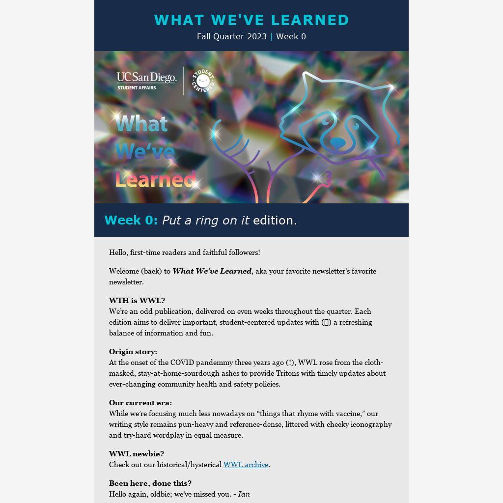 At the onset of the COVID pandemmy three years ago (!), WWL rose from the cloth-masked, stay-at-home-sourdough ashes to provide Tritons with timely updates about ever-changing community health and safety policies.
