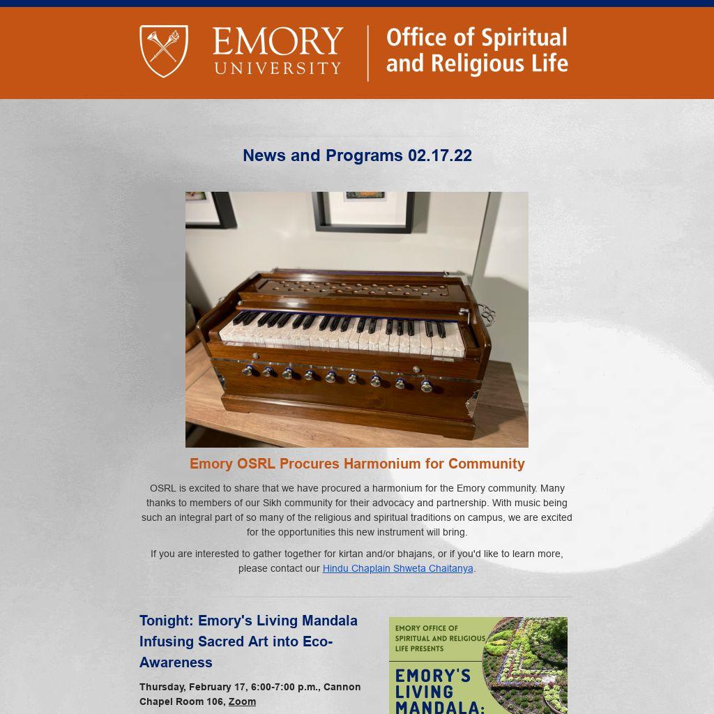Emory OSRL ENews is published weekly during term by the Emory University Office of Spiritual and Religious Life publicizing Atlanta-campus spiritual life programs. It is not a comprehensive listing. For Oxford College spiritual life, please click here. To submit information or to update your preferences, please contact religiouslife@emory.edu.