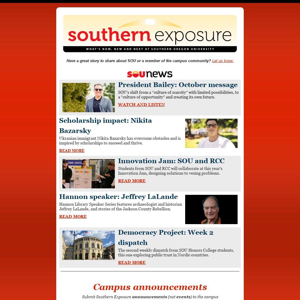 Submit Southern Exposure announcements (not events) to the campus community here. Campus events – other than those of campuswide and broad community interest – should instead be submitted to the SOU Events Calendar.