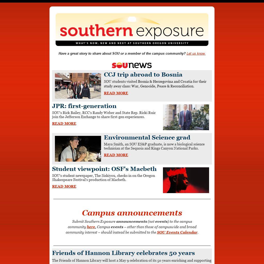 Submit Southern Exposure announcements (not events) to the campus community here. Campus events – other than those of campuswide and broad community interest – should instead be submitted to the SOU Events Calendar.