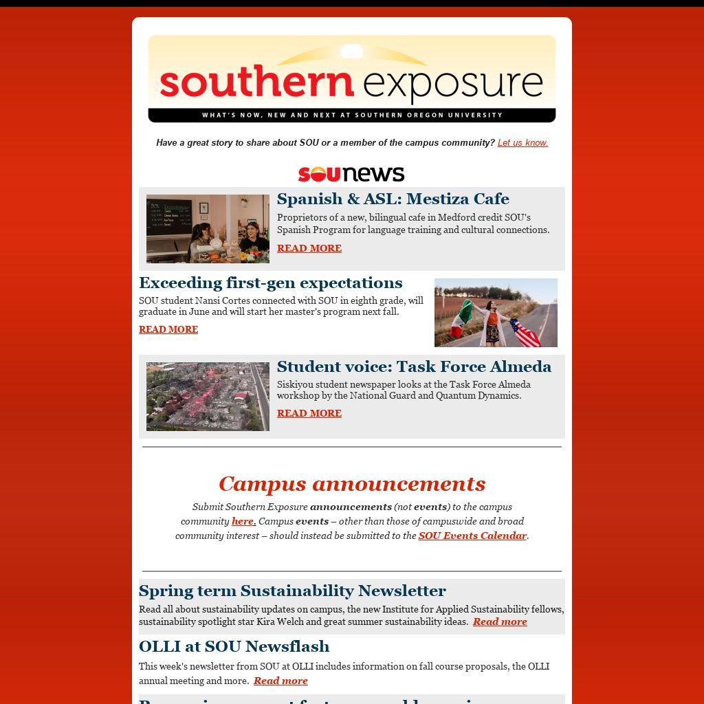 Submit Southern Exposure announcements (not events) to the campus community here. Campus events – other than those of campuswide and broad community interest – should instead be submitted to the SOU Events Calendar.