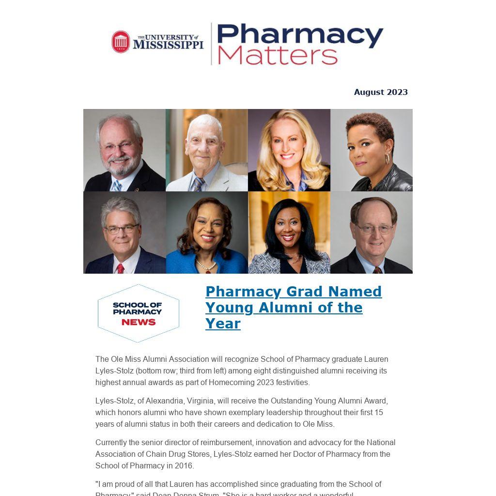 The Ole Miss Alumni Association will recognize School of Pharmacy graduate Lauren Lyles-Stolz (bottom row; third from left) among eight distinguished alumni receiving its highest annual awards as part of Homecoming 2023 festivities.