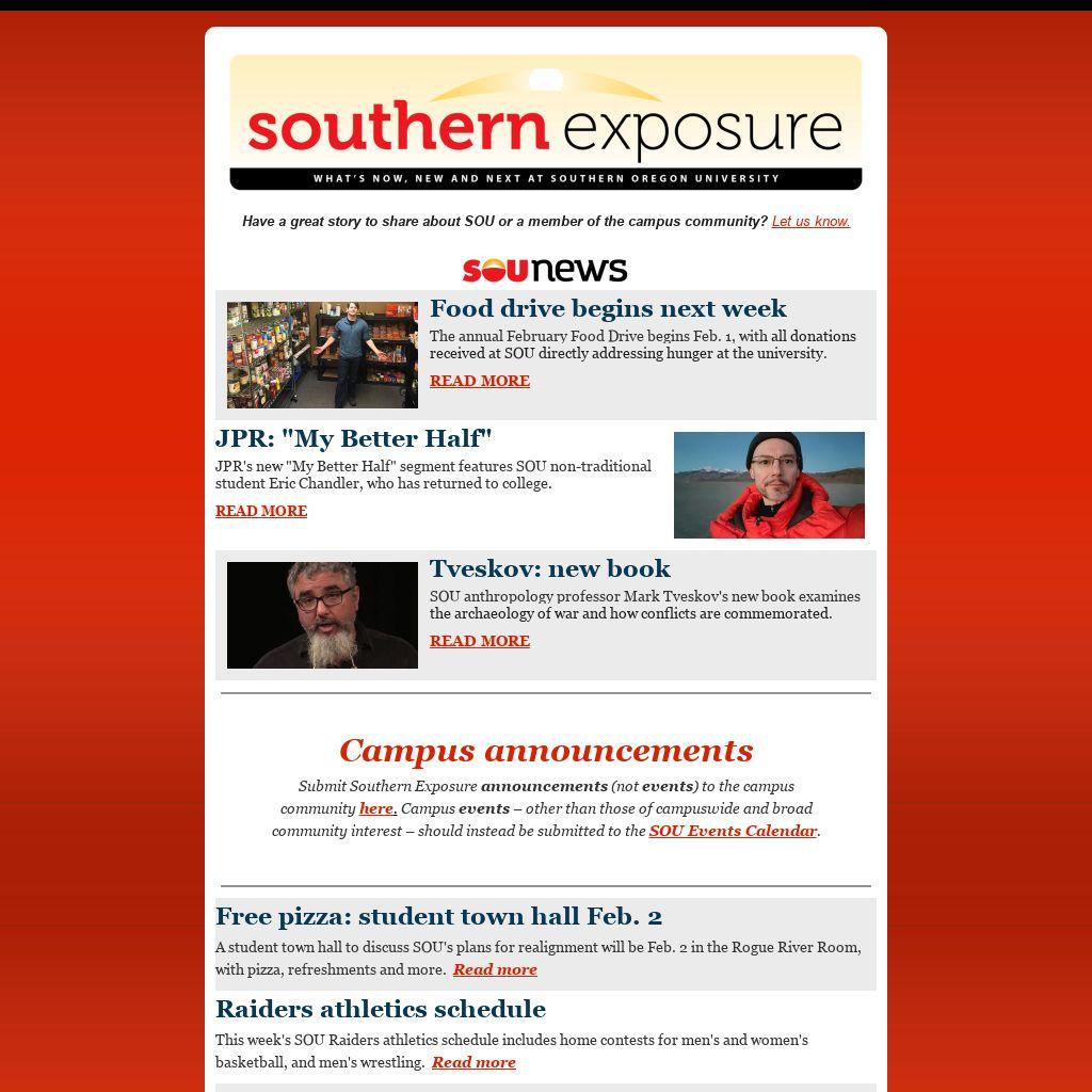 Submit Southern Exposure announcements (not events) to the campus community here. Campus events – other than those of campuswide and broad community interest – should instead be submitted to the SOU Events Calendar.