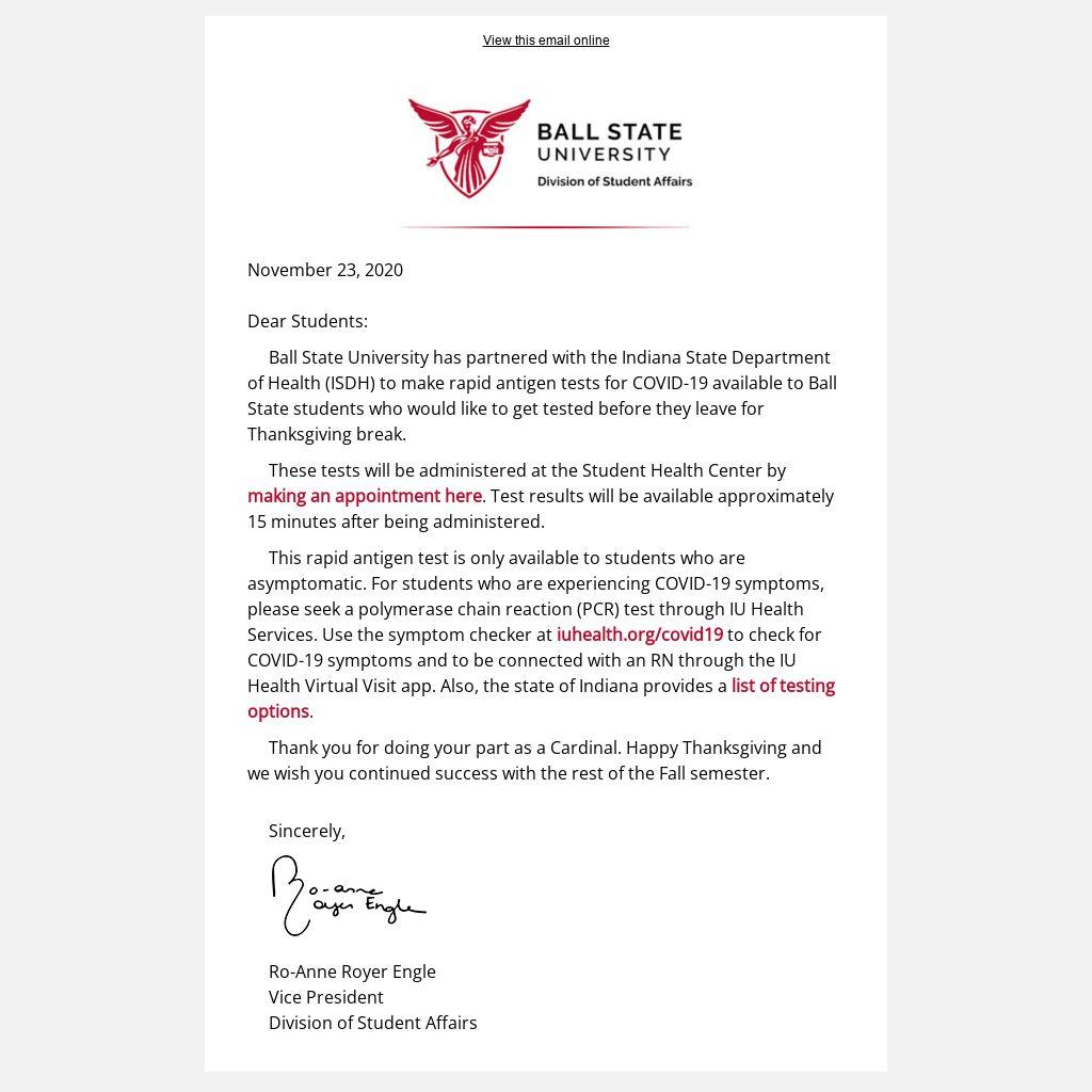 Ball State University has partnered with the Indiana State Department of Health (ISDH) to make rapid antigen tests for COVID-19 available to Ball State students who would like to get tested before they leave for Thanksgiving break.