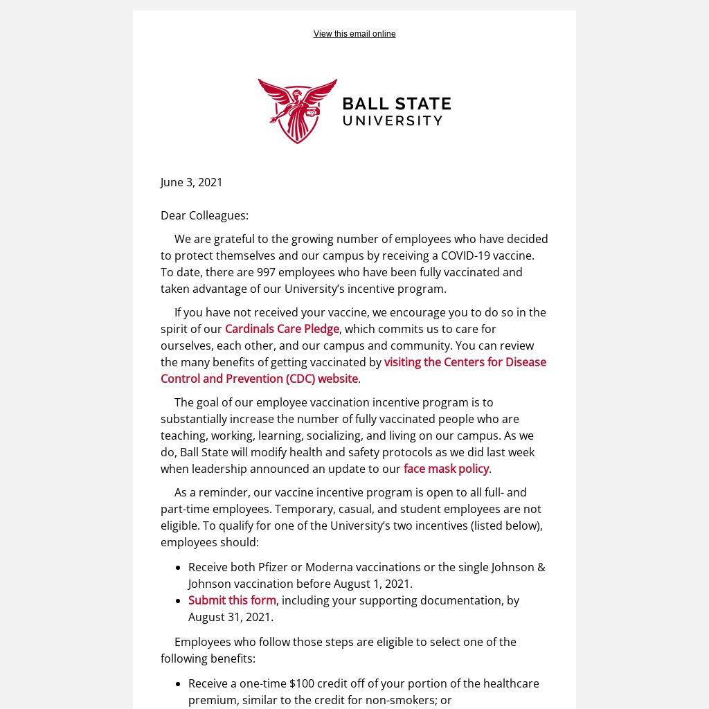 The goal of our employee vaccination incentive program is to substantially increase the number of fully vaccinated people who are teaching, working, learning, socializing, and living on our campus. As we do, Ball State will modify health and safety protocols as we did last week when leadership announced an update to our face mask policy.