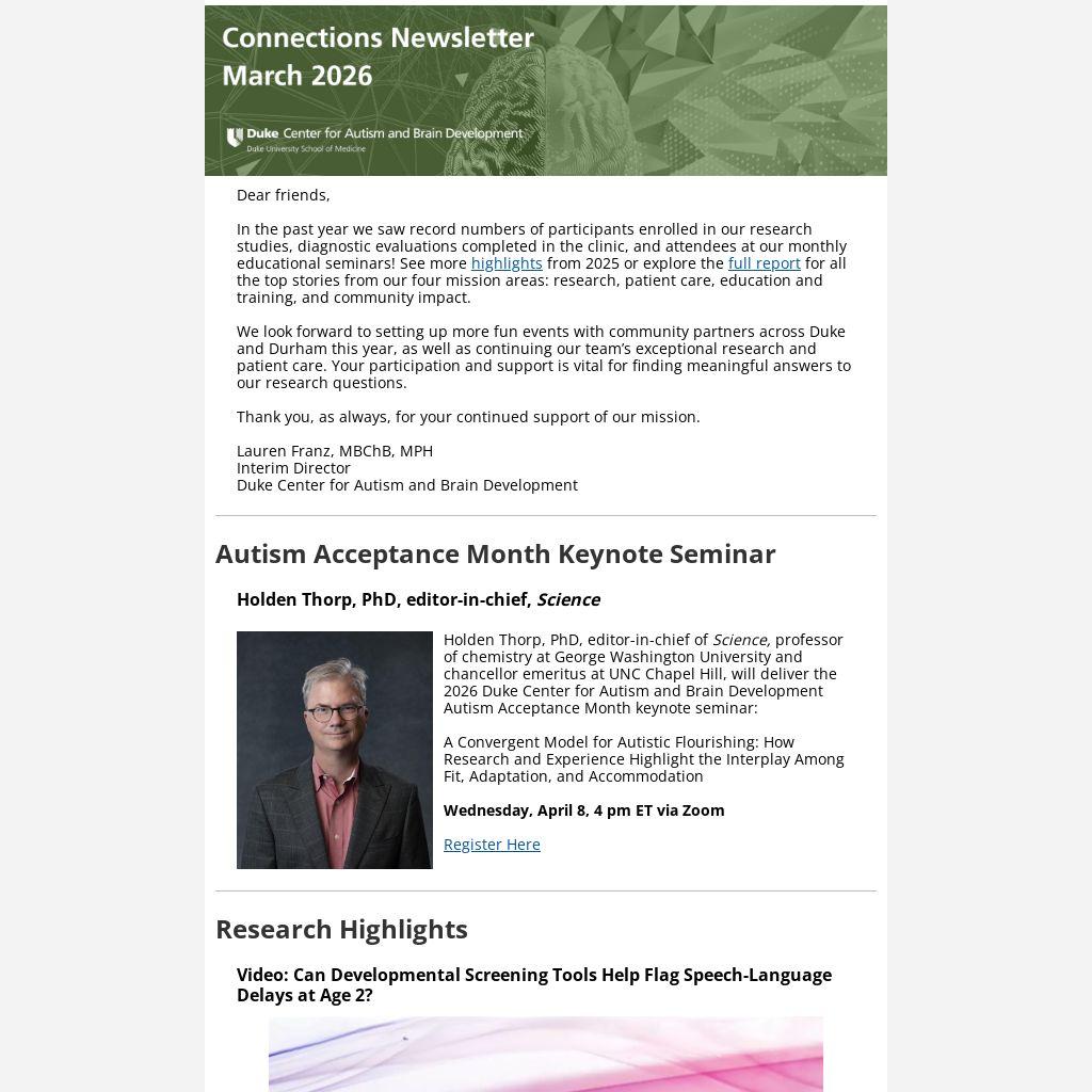 Holden Thorp, PhD, editor-in-chief of Science, professor of chemistry at George Washington University and chancellor emeritus at UNC Chapel Hill, will deliver the 2026 Duke Center for Autism and Brain Development Autism Acceptance Month keynote seminar: