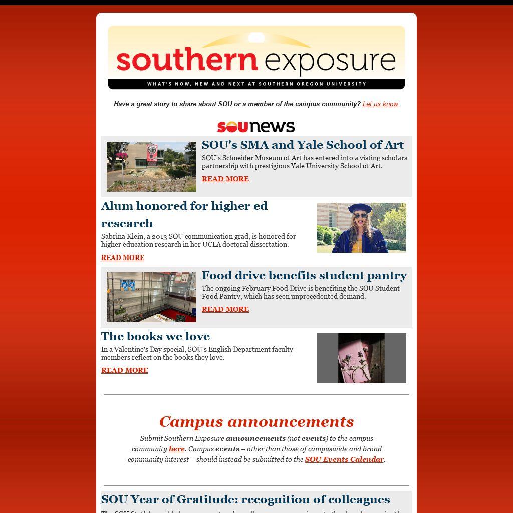 Submit Southern Exposure announcements (not events) to the campus community here. Campus events – other than those of campuswide and broad community interest – should instead be submitted to the SOU Events Calendar.