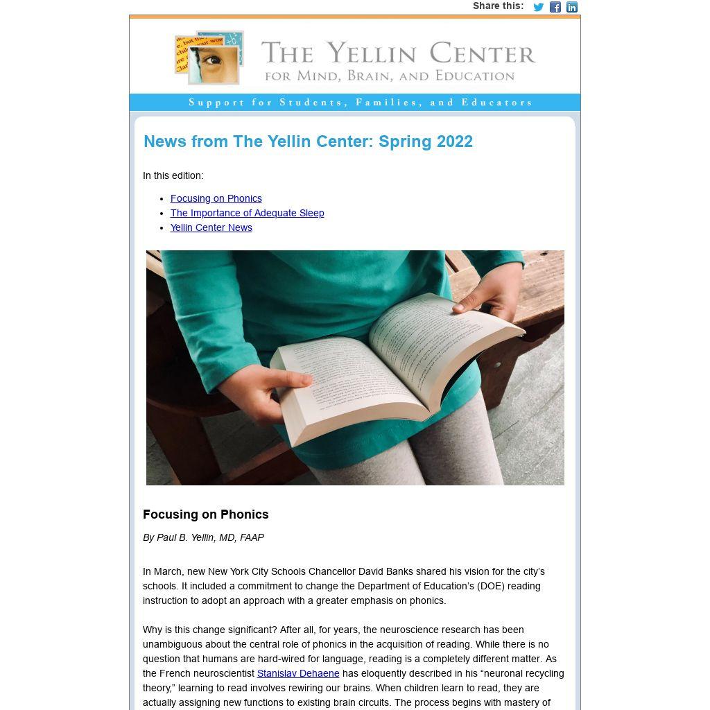 Reading challenges are among the most common concerns in every age group that we see at The Yellin Center-from early elementary school, through college, and even medical school. Subtle difficulties may go unnoticed, particularly in bright, highly verbal students. They may present as spelling difficulties, slow reading, or simply never reading for pleasure. Regardless, it is important to know that it is never too early or too late to help struggling readers. If you have questions about whether your child may have dyslexia or another reading challenge, you might want to start with a brief conversation during my call-in hour each Thursday morning from 8-9 am EST. No appointment is needed and there is no charge.