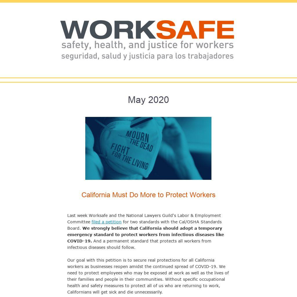 Last week Worksafe and the National Lawyers Guild's Labor & Employment Committee filed a petition for two standards with the Cal/OSHA Standards Board. We strongly believe that California should adopt a temporary emergency standard to protect workers from infectious diseases like COVID-19. And a permanent standard that protects all workers from infectious diseases should follow. Our goal with this petition is to secure real protections for all California workers as businesses reopen amidst the continued spread of COVID-19. We need to protect employees who may be exposed at work as well as the lives of their families and people in their communities. Without specific occupational health and safety measures to protect all of us who are returning to work, Californians will get sick and die unnecessarily. While Cal/OSHA and the State of California have published guidance documents that outline employer requirements for protecting workers from coronavirus exposure (see below for details), guidance can only do so much. A standard would give Cal/OSHA a more powerful tool to enforce the rules and hold employers accountable. Bottom line: Cal/OSHA urgently needs tools, staffing, and resources to engage in effective inspections and enforcement. We need a strong agency to ensure that all California workers can work safely and free from the hazards introduced or exacerbated by the pandemic. If employers are flouting regulations and endangering workers, or are unable to operate their business consistent with public health requirements, they must be confronted and penalized. Worksafe is dedicated to this vision of a strong Cal/OSHA, one that is able to provide answers and protections for all of us rightly concerned about going to work during a pandemic. California’s workers need enforceable rules to keep employers accountable and keep workplaces safe. In Solidarity, Augustin, Joan, Jora, Karin, Maggie, Mara, Nicole, Stephen, and Thais