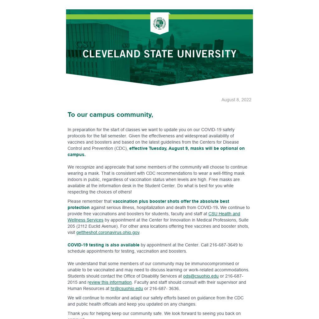In preparation for the start of classes we want to update you on our COVID-19 safety protocols for the fall semester. Given the effectiveness and widespread availability of vaccines and boosters and based on the latest guidelines from the Centers for Disease Control and Prevention (CDC), effective Tuesday, August 9, masks will be optional on campus.
